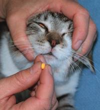 Prendete una nuova pillola dalla confezione, sistemate il gatto in grembo tenendo le zampe anteriori ben salde nella mano sinistra. Forzate l’apertura delle fauci e spingete la pillola in bocca con il dito indice della mano destra. Tenetegli la bocca chiusa e contate fino a dieci.