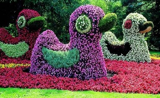 E 'grazie a questo microclima probabilmente, che nell'isola possono vivere tantissime varietà di fiori, tra le più belle e colorate, aiuole grandi, piccole e tante statue fatte con tante qualità di fiori, anatre, cigni, pavoni e delle montagne tutte di viole, di primule di altri fiori che per la verità non conoscevo e non conosco il nome, di tutti i colori. Altra cosa che mi ha colpito sono le serre delle piante grasse, grandissime di cui una, che mi sarebbe veramente piaciuto portare a casa, un nome una garanzia ,.. “Cuscino per suocera”. Ad una mia battuta tutto il gruppo esplose in una sonora risata. Tra un animale fatto di fiori e una montagna colorata, spicca una cartina, con tanto di bandierine delle città intorno al lago, la leggenda della zona in cui ci troviamo ma fatta di fiori, la guida ci faceva notare che la bandierina dell'isola di Mainau era gialla e azzurra, invece di un simbolo giallo e nero indicante l’appartenenza al Land del Baden-Württemberg, perché è di proprietà della famiglia reale svedese, dal 1907.