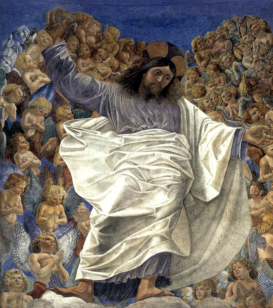 Più che mai convincenti sono le figure sospese illusionisticamente nel vuoto, ricreate forse studiando dei modellini in cera sospesi con dei fili, magari riflessi in uno specchio posato per terra. Melozzo non aveva però ancora compreso, come fecero poi Raffaello (nella cappella Chigi a Santa Maria del Popolo) e Correggio (a Parma), che se la veduta dal basso era adeguata per le figure alla base della cupola, per quelle al centro era necessaria una veduta orizzontale.