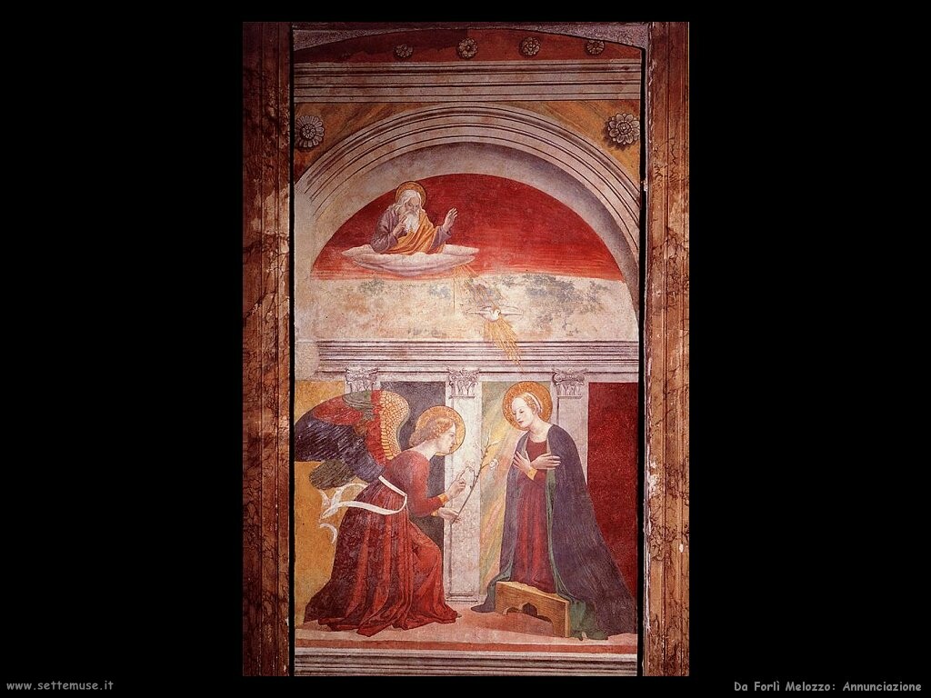 Altre opere da ricordare sono gli affreschi della Cappella di S.Elena nella Chiesa di S.Croce in Gerusalemme a Roma (1489). Sempre a Roma, alla scuola di Melozzo è attribuito l’affresco dei Dottori della Chiesa nella basilica di Santa Francesca Romana, nei pressi del Colosseo. L’artista, realizzò anche la decorazione di alcuni soffitti del Palazzo Comunale di Ancona (1493). Oltre ai bellissimi affreschi, Melozzo da Forlì ci ha lasciato anche diversi dipinti, fra i quali vogliamo ricordare l’Annunciazione, ora nella Galleria degli Uffizi a Firenze. Solo in tempi relativamente recenti si è riscoperto il valore di questo pittore di origine romagnola e, anche se poche delle sue opere sono giunte fino ai giorni nostri, esse sono, comunque, in numero sufficiente a testimoniare la portata dei capolavori di questo grande artista e maestro della pittura quattrocentesca.
