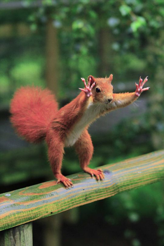Cosa non farebbe un roditore affamato pur di attirare l'attenzione. Questo scoiattolo rosso (Sciurus vulgaris) ospite del British Wildlife Centre, nel Surrey (Inghilterra), si è messo in posizione "da portiere" per non passare inosservato agli occhi del fotografo, che stava distribuendo noccioline ad altri suoi compari. Con le zampe protese in avanti ha ottenuto l'obiettivo ed è diventato in breve una specie di star all'interno del centro, che si occupa della salvaguardia di questi animali. «Resta in equilibrio sulle zampe posteriori con quelle anteriori protese in cerca di cibo» ha spiegato il fotografo «in una posizione che lo distingue dalla mischia».