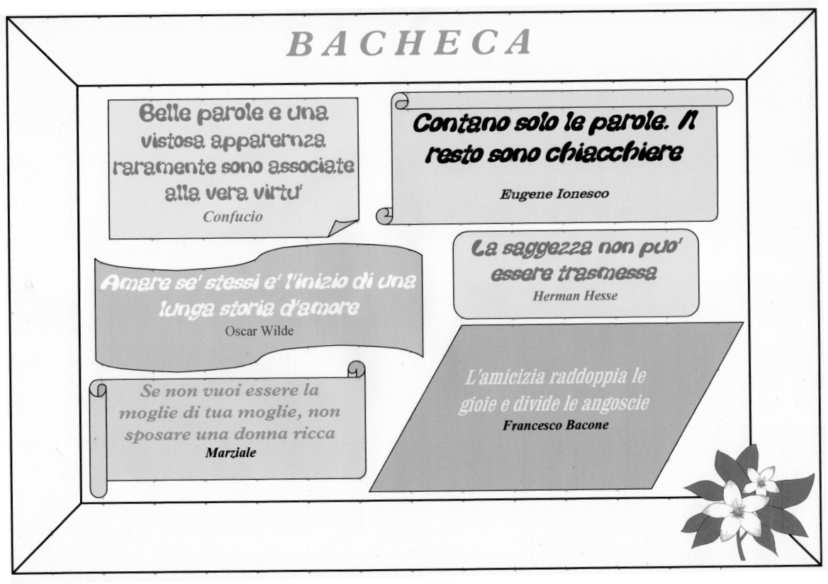 Non è stato un regalo di grande valore, ma lei che apriva il cassetto per vedere se le foto c’erano sempre, ora le ha a portata di mano ed il regalino, che era stato fatto con il cuore, le ha donato grande gioia. Intanto anche la Direzione aveva saputo degli aforismi, non ho mai saputo se dal dottore o dall’infermiere. So per certo, però, che è stato apprezzato, perché qualche settimana dopo, entrando, vidi su un pannello tanti cartoncini colorati sui quali, con pennarelli di vari colori, sono state ricopiate le frasi tratte da un mio libro. Lo so, non è tanto, ma vedere che un tuo semplice passatempo viene apprezzato e, anche dopo tanto tempo, è stato utile per portare un po’ di conforto e sollievo morale a delle persone che vivono in una comunità, è un grande piacere. Scoprirlo, per me è stato bellissimo.