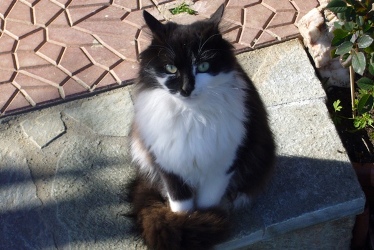Finito il mio giro tornai a casa e a metà sentiero la vidi  venirmi incontro,  alzare la testina miagolando.  L’accarezzai, mi si affiancò e tornammo tranquille a casa. Aprii il cancello, lei attraversò le sbarre andandosene con un miao per i fatti suoi. Dopo qualche mese ebbe 3 micetti neri, quanto lei è  bianca. Uno  in particolare  era un bel  batuffolo! Crebbe sempre più  arruffato e sempre più attaccato alla madre: lo chiamammo Ciuffo. Finì col seguire la madre anche quando mi accompagnava nelle passeggiate, uno a destra,  l’altra a sinistra. Naturalmente si  fermava, anche lui, con la madre. Al mio ritorno ecco Ciuffo da un lato e Fiona dall’altro,  che mi aspettavano.