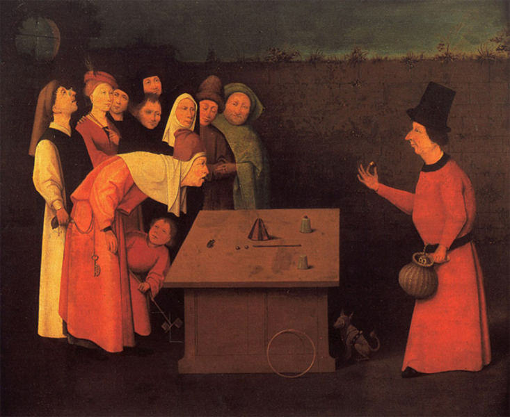 Al tema della passione di Cristo Bosch dedicò poi alcune delle sue massime realizzazioni, nelle quali dispiegò tutte le sue risorse di tecnica scenografica e luminosità. L’incoronazione di spine e la Salita al Calvario. In quest’ultimo si evidenziavano spunti di caricatura spinta al parossismo a testimonianza dell’antisemitismo del tempo. Il Prestigiatore, rappresentato dal profilo ripugnante dell’uomo a destra, che si fa accompagnare da una civetta in un paniere, tradizionale simbolo d’inganno, e da un cagnolino agghindato come un saltimbanco.
