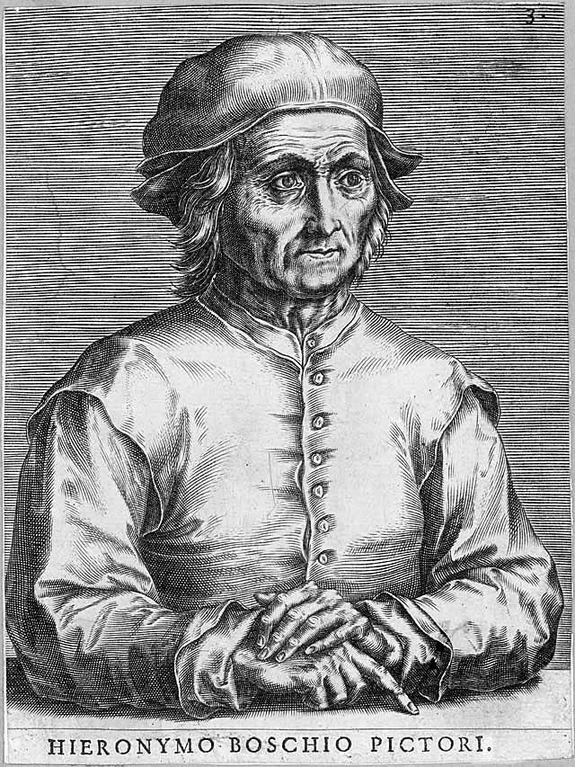 Hieronymus Bosch, appellativo dal nome abbreviato della città natale (‘s-Hertogenbosch, in francese Bois-le-Duc), fu un pittore fiammingo, nato 156 anni prima di Rembrandt! Nella sua famiglia sembra si fossero avuti numerosi pittori e scultori. La sua esistenza non ha lasciato che minime tracce negli archivi: sposato (1481), membro della confraternita di Notre-Dâme, aveva una casa nella piazza principale della città. L’ambiente e il clima spirituale di Bois-le Duc non spiegano nulla della sua formazione, anche perché poco noti. Circa quaranta tavole, per lo più di piccolo formato, e una ventina di disegni costituirono la sua produzione: una produzione interamente, o quasi, a carattere religioso.