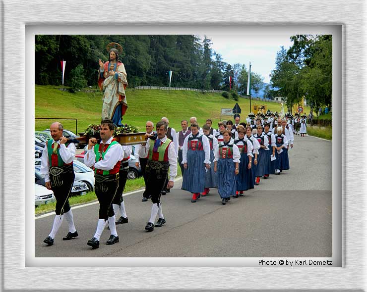 Tutti indossano gli abiti tipici del luogo, gli stendardi più belli son portati a spalle dagli uomini e per finire c’è sempre la banda con i suonatori vestiti a festa, orgogliosi dei loro costumi Tirolesi.