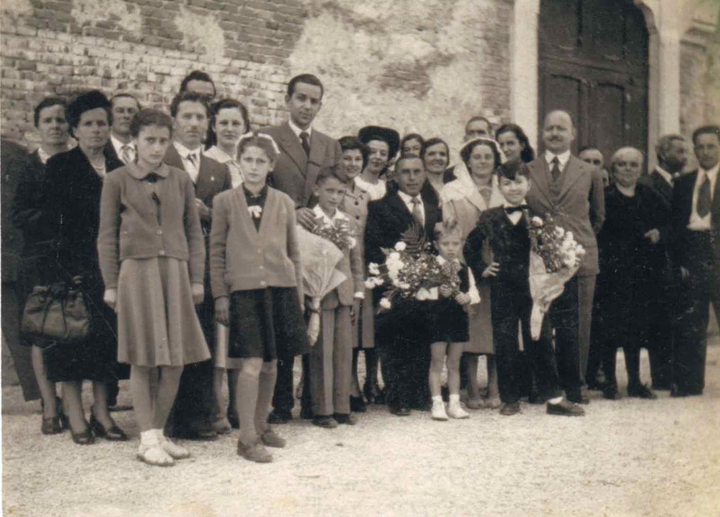 Rituale foto di gruppo fuori dalla chiesa: il fantastico Carletto è davanti ad Angela insieme a molti parenti e amici.
