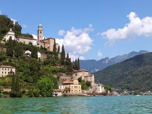 Un rumore di motore, un richiamo e mi sporgo dalla ringhiera verso il lago: eccoli padre e figlia sfrecciare veloci sul motoscafo, mio marito tiene sua figlia davanti lui e la lascia guidare. Io urlo “Andate adagio” ma sono parole al vento, si divertono tanto, vanno  al confine e poi tornano.  "Vieni anche tu mamma, dai, provaci…." "No io su quel coso non metterò più piede, mi è bastato la prima volta". Finalmente scende, mentre Aldo sistema lo scafo, noi due facciamo una passeggiata. E' un bel sentiero che in breve ci porta sul piazzale del Santuario Della Madonna della Caravina.