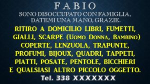Ha due figli entrambi emigrati, uno in Germania e l’altro in Inghilterra ma non possono aiutarlo e non trova nessuno disposto a dargli almeno un piccolo aiuto ma deve pur vivere per cui deve racimolare qualcosa per risolvere il problema vita.