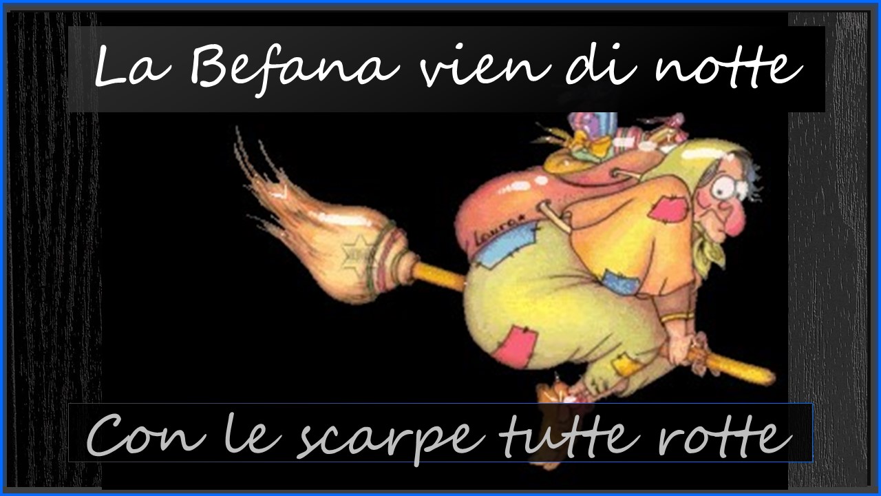 È l’Epifania ovvero la Befana, l’hanno sempre descritta come una vecchietta con al naso un brufolo rosso e gli occhiali rotti, le ciabatte tutte a pezzi ed una gonna brutta larga e malfatta, la gobba e un grosso sacco nero pieno di dolcetti e carbone caricati sulle spalle e usa la scopa volante per svolazzare di casa in casa onde lasciare i doni ai bambini buoni, ed il carbone ai cattivi, ma ci sono bambini cattivi?